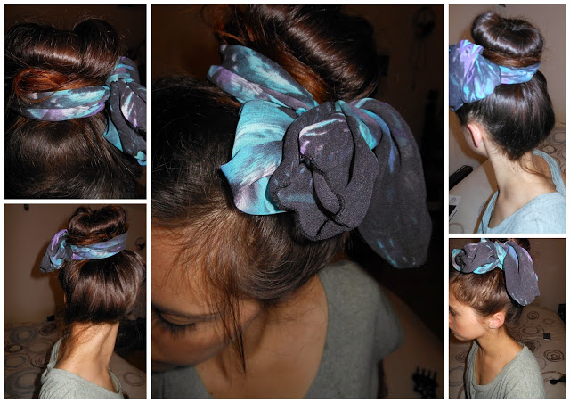 Ensuite, il n'y a plus qu'à enrouler vos mèches autour du chignon tout en les maintenant avec des mini pinces crabes, pas besoin de s'ennuyer avec des épingles car le foulard recouvrira les pinces. Enroulez votre foulard et faites votre nœud papillon. Soit devant pour un style à la Lady Gaga ou sur le côté pour un effet petite fille sage qui n'a rien à se reprocher (lol).