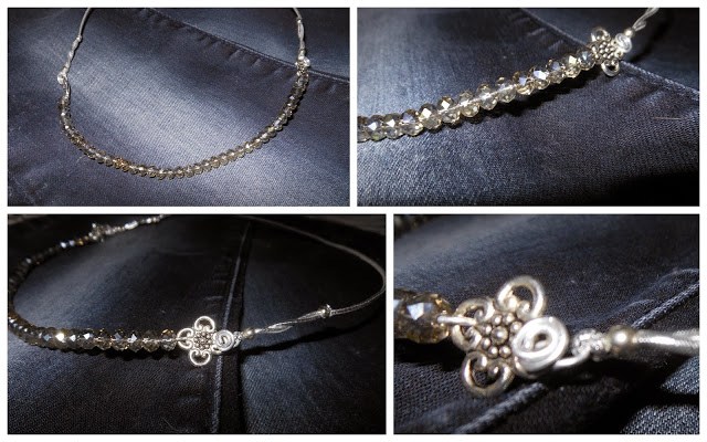 Ce headband tient son originalité par le fait qu'il se porte sur le front, il me fait penser aux bijoux que portent les elfes dans le Seigneur des Anneaux par exemple sauf qu'il est plus discret et qu'il s'accordera plus facilement avec vos tenues du quotidien. Le fil qui tient les cristaux peut se tordre, on peut donc former des vagues ou ondulations ou le laisser droit (comme moi). La couleur des cristaux est magnifique et varie en fonction de la luminosité du gris foncé au plus clair, les petites fleurs en métal sur le côté égayent la coiffure et la mettent en valeur.